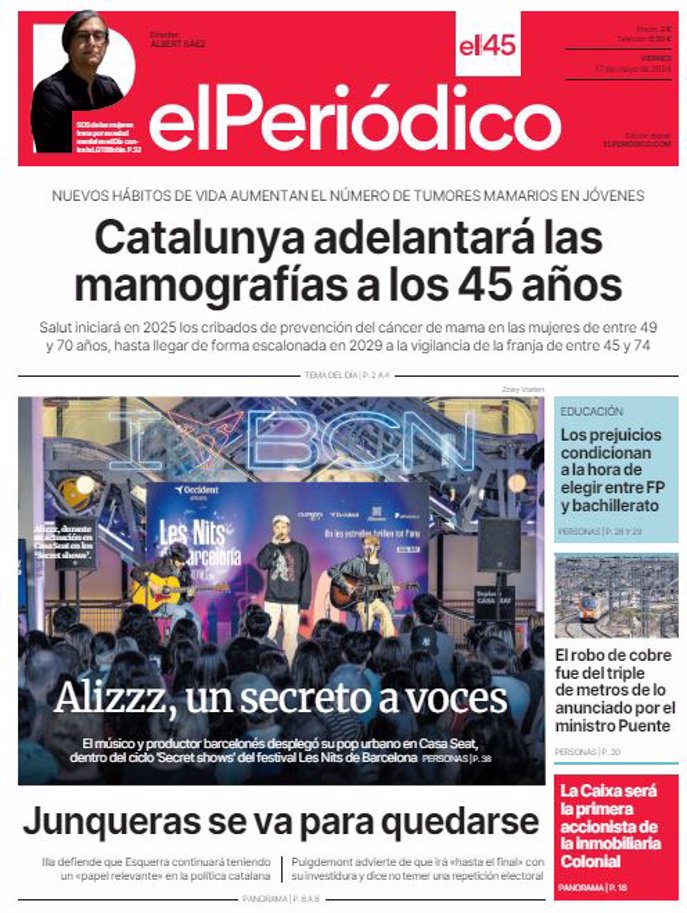 LE JOURNAL: « La Catalogne avancera la mammographie jusqu'à 45 ans » ; « Alizz, un secret de polichinelle » ; « Junqueras part pour rester » ; « Les préjugés déterminent le choix entre la formation professionnelle et le lycée » ; « Le vol de cuivre a représenté trois fois plus de mètres que ce qu'a annoncé le ministre Puente » ; « La Caixa sera le premier actionnaire de la société immobilière Colonial. »