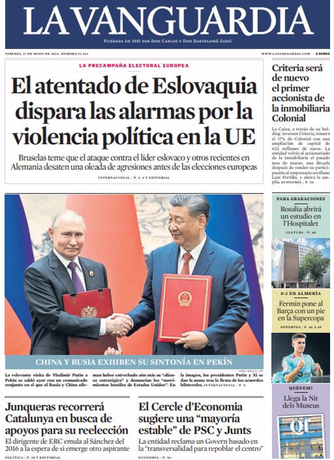 L'AVANT-GARDE: « L'attaque en Slovaquie déclenche l'alarme sur la violence politique dans l'UE »; « Junqueras parcourra la Catalogne à la recherche de soutiens pour sa réélection » ; « Le Cercle d'Economia suggère une « majorité stable » de PSC et de Junts » ; « Criteria sera à nouveau le premier actionnaire de la foncière Colonia. »