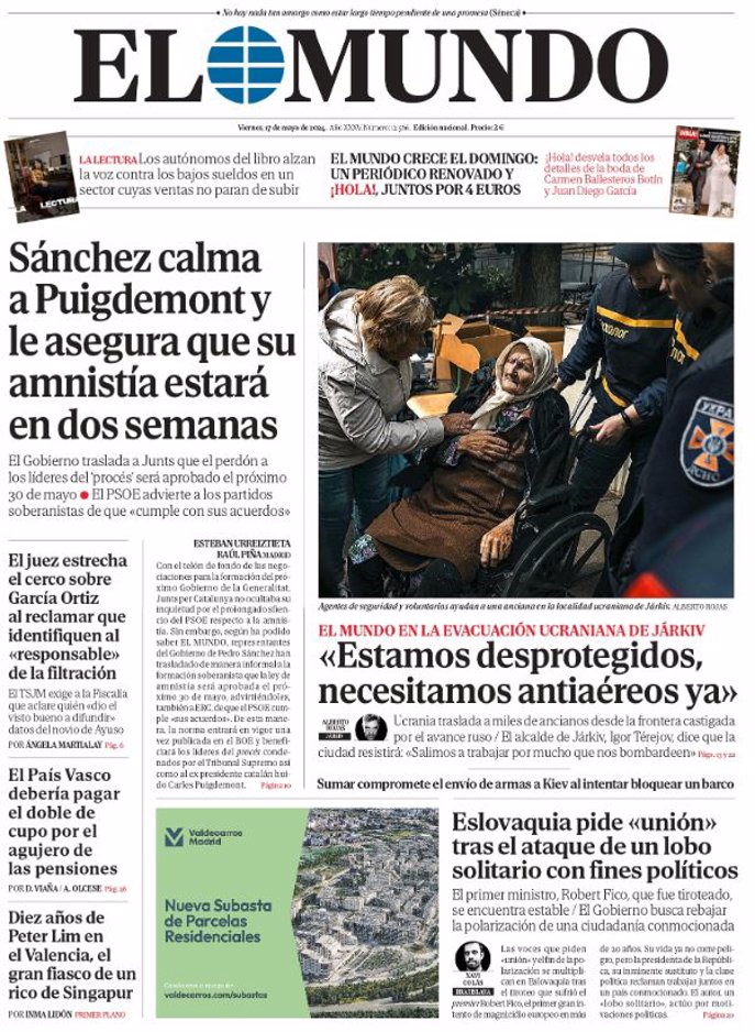 LE MONDE: « Sánchez calme Puigdemont et lui assure que son amnistie aura lieu dans deux semaines »; « Le juge resserre la barrière contre García Ortiz pour identifier la personne « responsable » de la fuite » ; « Le Pays Basque devrait payer deux fois plus pour le trou des retraites » ; « Dix ans de Peter Lim à Valence, le grand fiasco d'un homme riche à Singapour » ; «  »Nous ne sommes pas protégés, nous avons besoin d'armes anti-aériennes maintenant » » ; « La Slovaquie appelle à 'l'unité' après une attaque de loup solitaire à des fins politiques ».