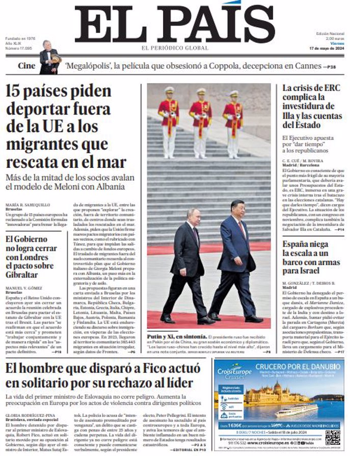 LE PAYS: « 15 pays demandent l'expulsion hors de l'UE des migrants secourus en mer » ; « L'homme qui a tiré sur Fico a agi seul en raison de son rejet du leader » ; « Le gouvernement ne parvient pas à conclure l'accord sur Gibraltar avec Londres » ; « La crise de l'ERC complique l'investiture d'Illa et les comptes de l'Etat » ; « L'Espagne refuse l'escale à un navire transportant des armes destinées à Israël. »