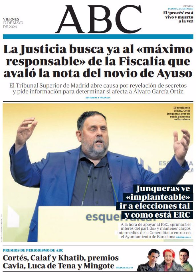 ABC: « La justice recherche actuellement la « personne haut placée » du parquet qui a approuvé la note du petit ami d'Ayuso » ; « Junqueras considère la participation aux élections comme « imprévisible » comme l'est l'ERC »; « Prix Cortés, Calaf et Khatib, Cavia, Luca de Tena et Mingote. »