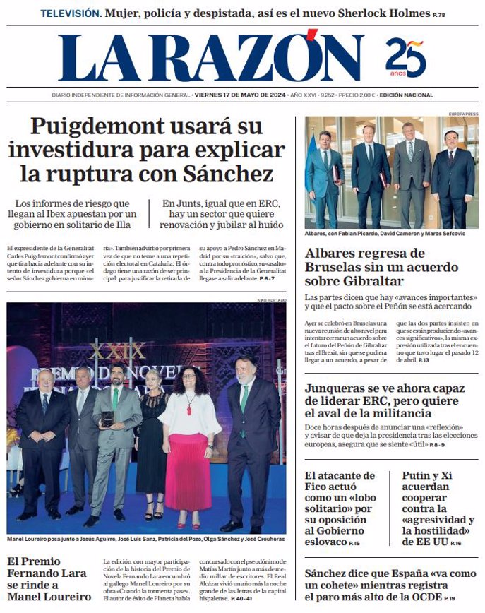 LA RAISON: « Puigdemont profitera de son investiture pour expliquer la rupture avec Sánchez »; « Le Prix Fernando Lara est attribué à Manel Loureiro » ; « Albares revient de Bruxelles sans accord sur Gibraltar »; « Junqueras se voit désormais capable de diriger l'ERC, mais il veut le soutien des militants »; « L'agresseur de Fico a agi comme un « loup solitaire » en raison de son opposition au gouvernement slovaque » ; « Poutine et Xi conviennent de coopérer contre « l’agressivité et l’hostilité » des États-Unis » ; « Sánchez affirme que l'Espagne « va comme une fusée » tout en enregistrant le taux de chômage le plus élevé de l'OCDE. »