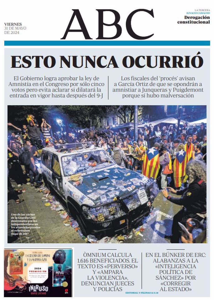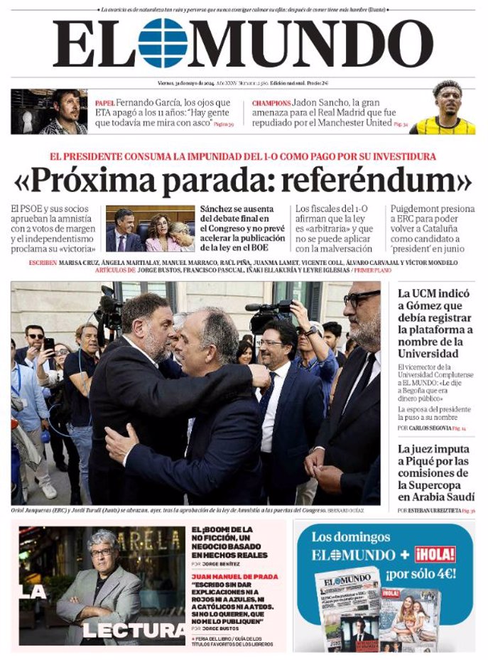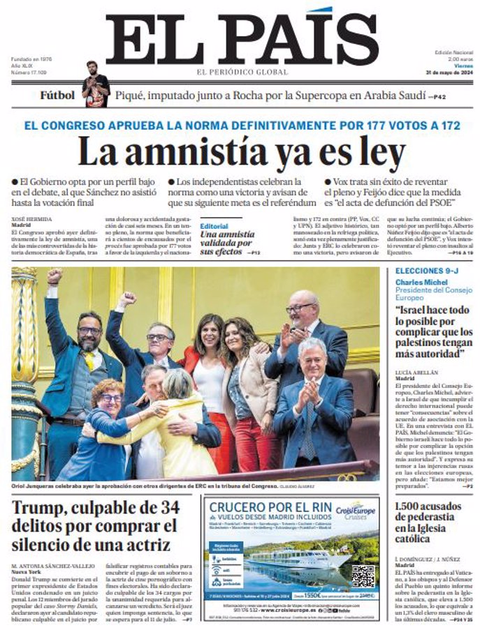LE JOURNAL: « Les procureurs du procès refusent d'accorder l'amnistie pour détournement de fonds »; « Trump, coupable de toutes les accusations » ; « Un entrepreneur de défense pro-israélien se rend en Espagne en pleine crise diplomatique » ; « L'Europe entretient au moins sept différends environnementaux avec la Catalogne » ; « Le Luxembourg demande au juge Moreno de lui confier l'intégralité de l'enquête sur l'affaire Koldo » ; « Le juge accuse Piqué des commissions de la Super Coupe d'Arabie Saoudite. »
