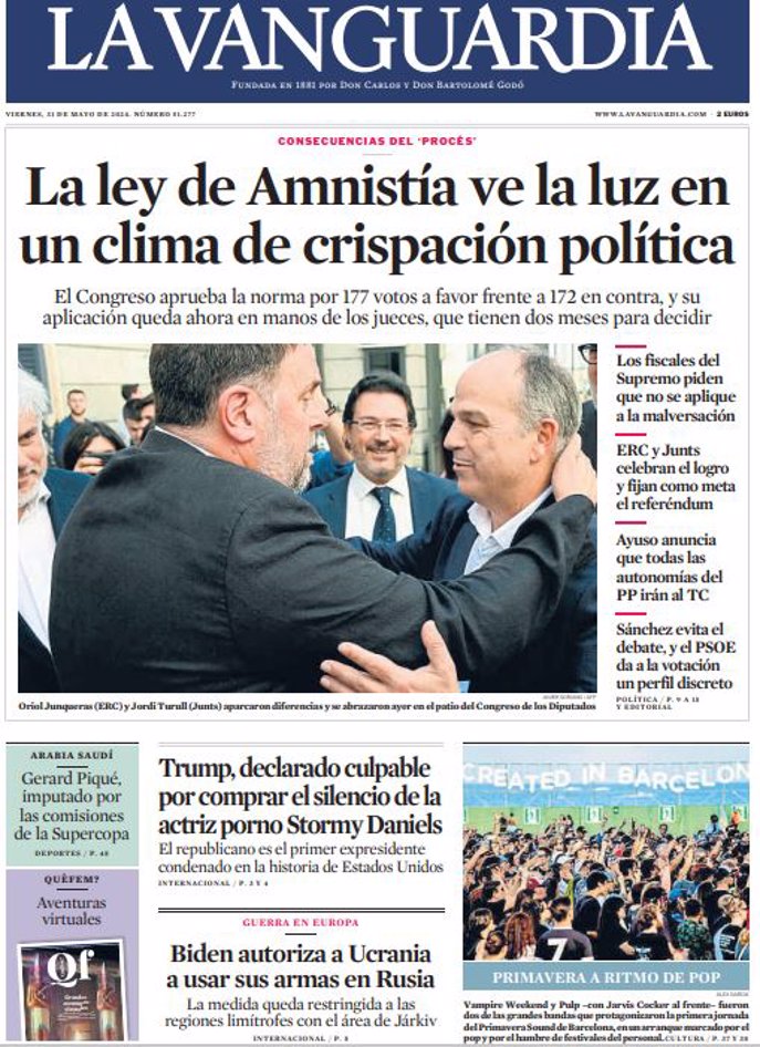 L'AVANT-GARDE: « La loi d'amnistie apparaît dans un climat de tension politique » ; « Trump, reconnu coupable d'avoir acheté le silence de l'actrice porno Stormy Daniels » ; « Biden autorise l'Ukraine à utiliser ses armes en Russie. »